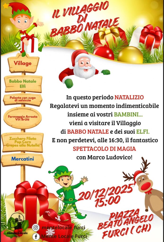 Sabato 20 dicembre 2025, a cominciare dalle 15, Furci si anima con i tradizionali mercatini di Natale e il villaggio di Babbo Natale, un appuntamento pensato per grandi e piccini. La manifestazione, che si terrà nel centro del paese, offrirà ai visitatori la possibilità di passeggiare tra le casette decorate, scoprire prodotti artigianali e gustare specialità gastronomiche locali.