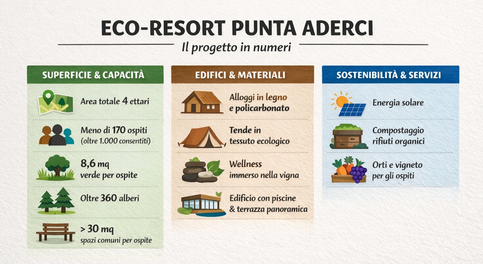 L’indice di utilizzo del suolo pari a 0,353 metri quadrati per metro quadrato di superficie fondiaria, valore inferiore al limite massimo consentito di 0,60. La capacità ricettiva prevista è di meno di 170 ospiti, a fronte di una potenzialità massima superiore alle mille unità consentita dalle norme urbanistiche della zona.