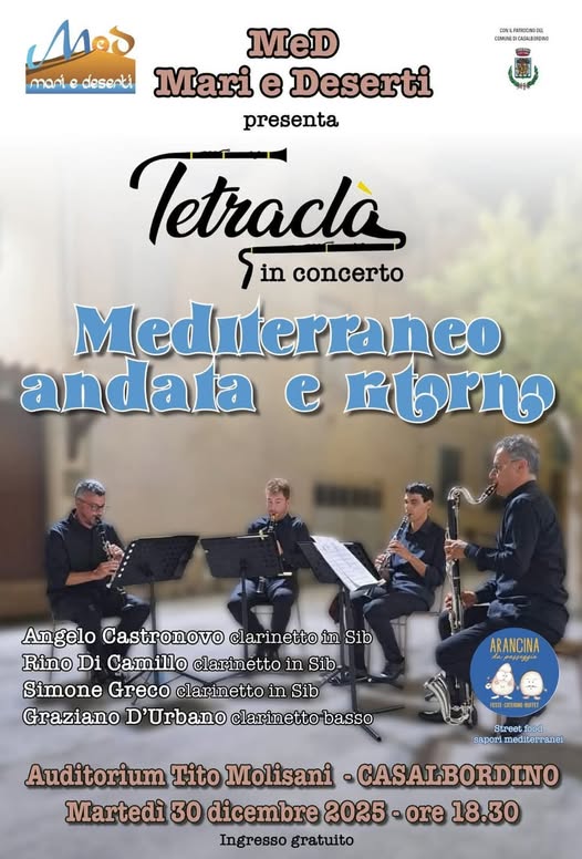 L’associazione culturale MeD-Mari e Deserti ha organizzato il concerto Mediterraneo andata e ritorno in programma il prossimo 30 dicembre, alle ore 18.30, all’auditorium “Tito Molisani” a Casalbordino.