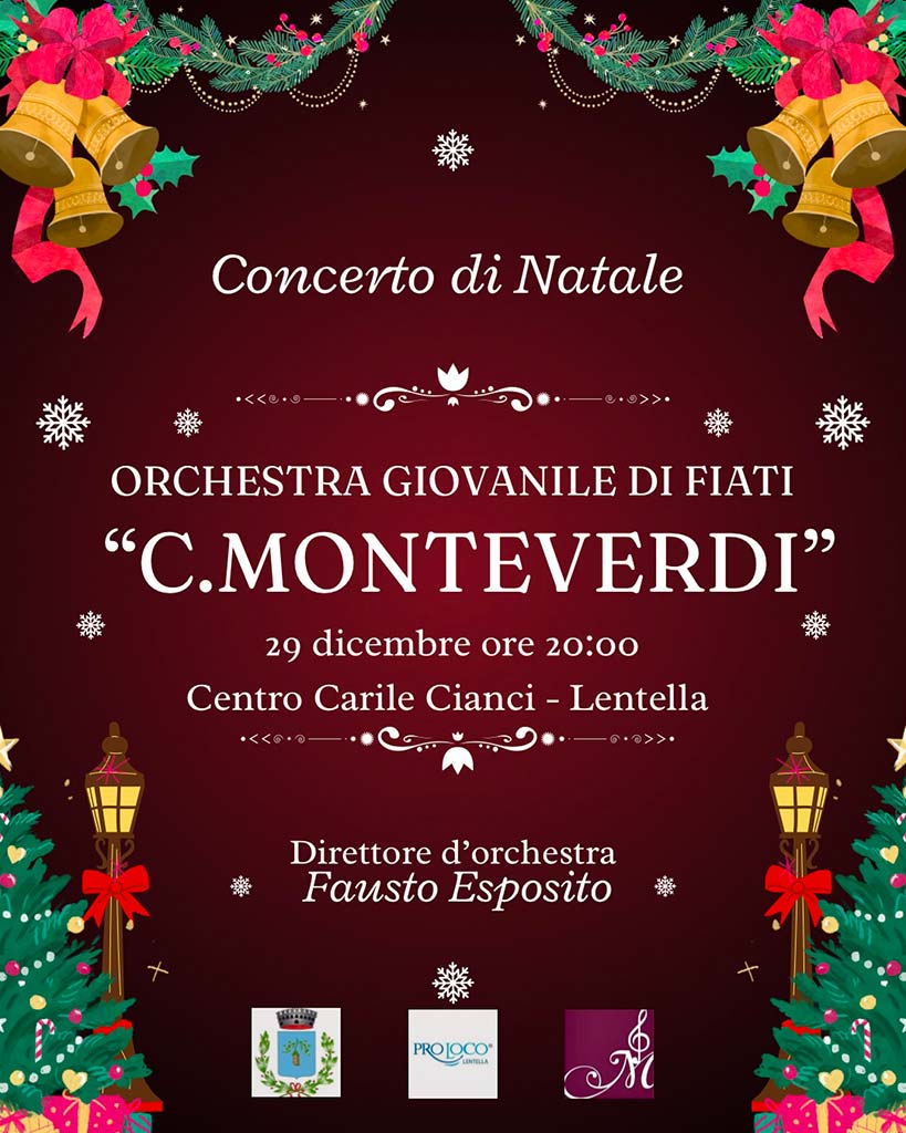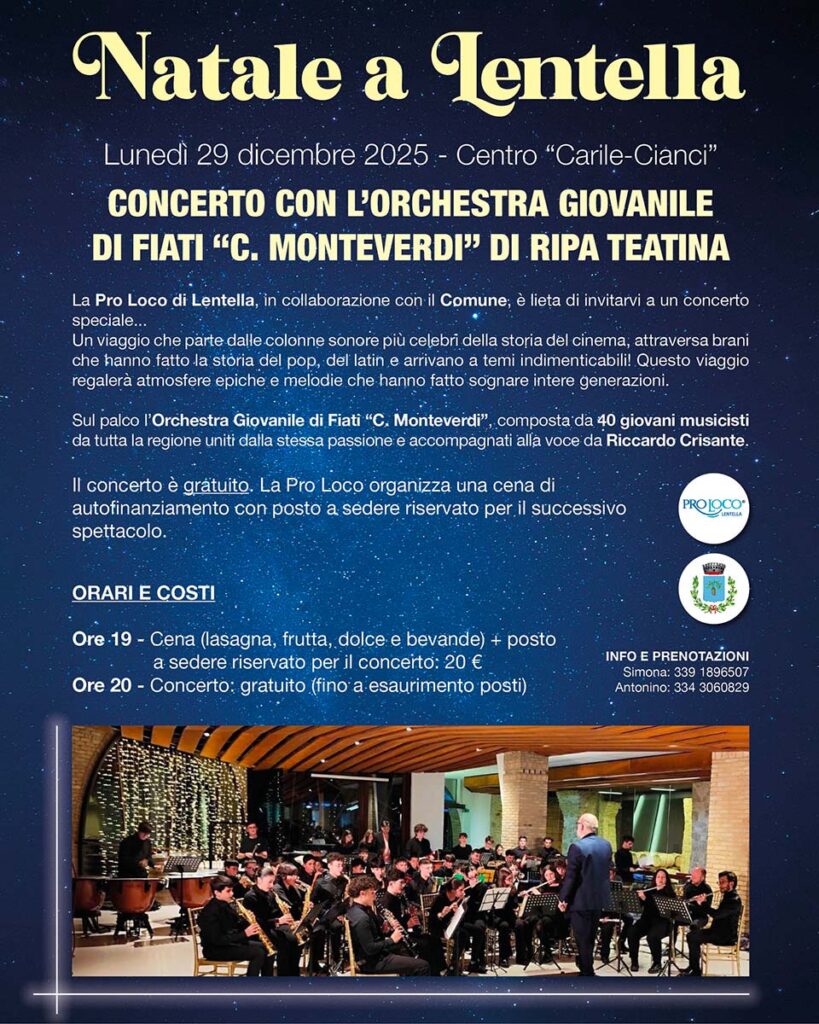 Lunedì 29 dicembre a Lentella si terrà il concerto dell’Orchestra giovanile di fiati “C. Monteverdi” di Ripa Teatina. Organizzato dalla Pro Loco Lentella, in collaborazione con il Comune, lo spettacolo musicale, a ingresso libero, si terrà al centro “Carile-Cianci”.