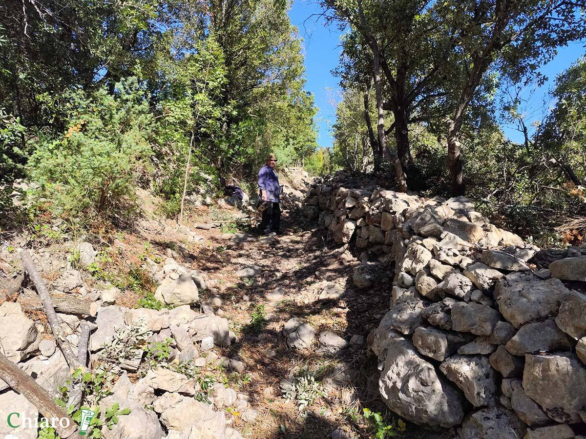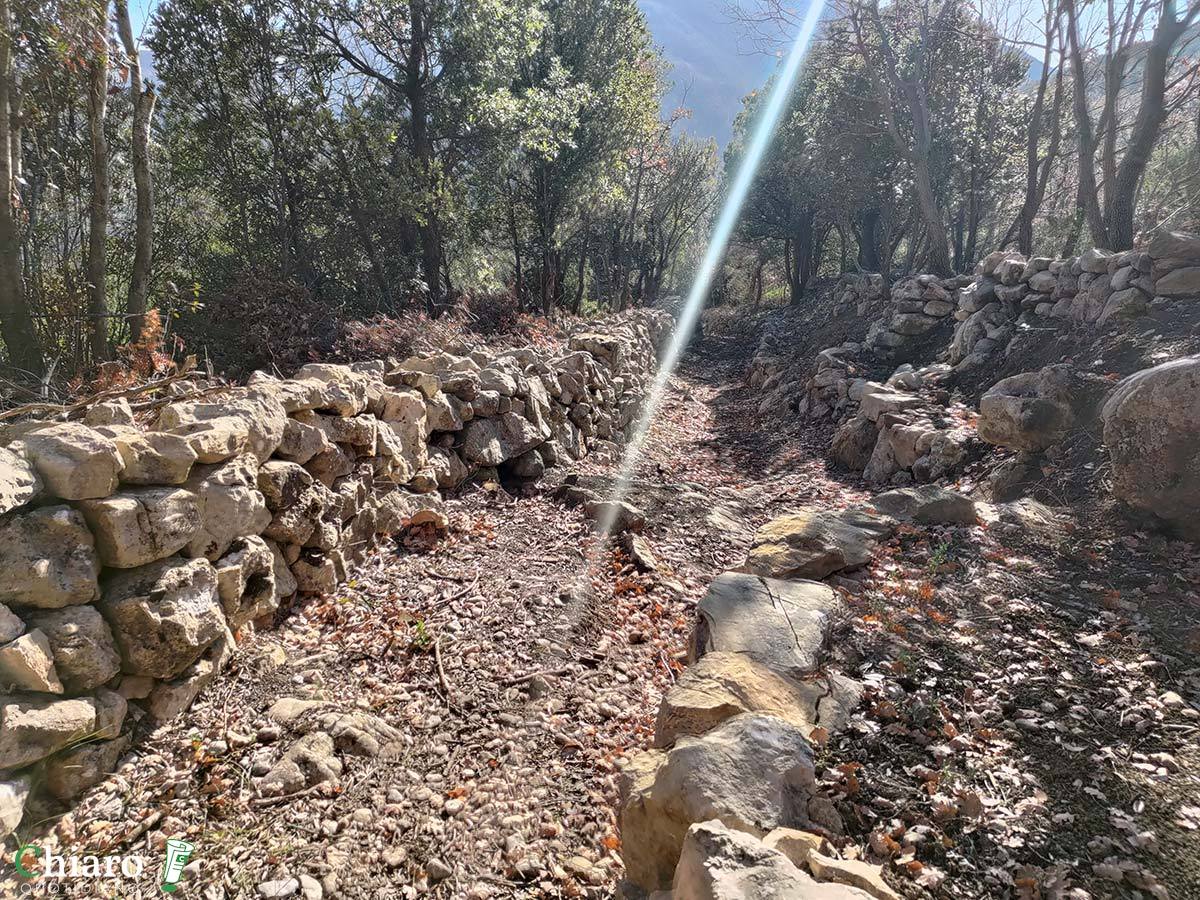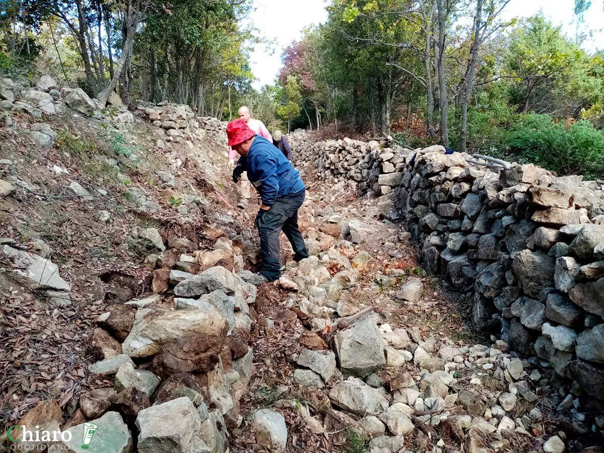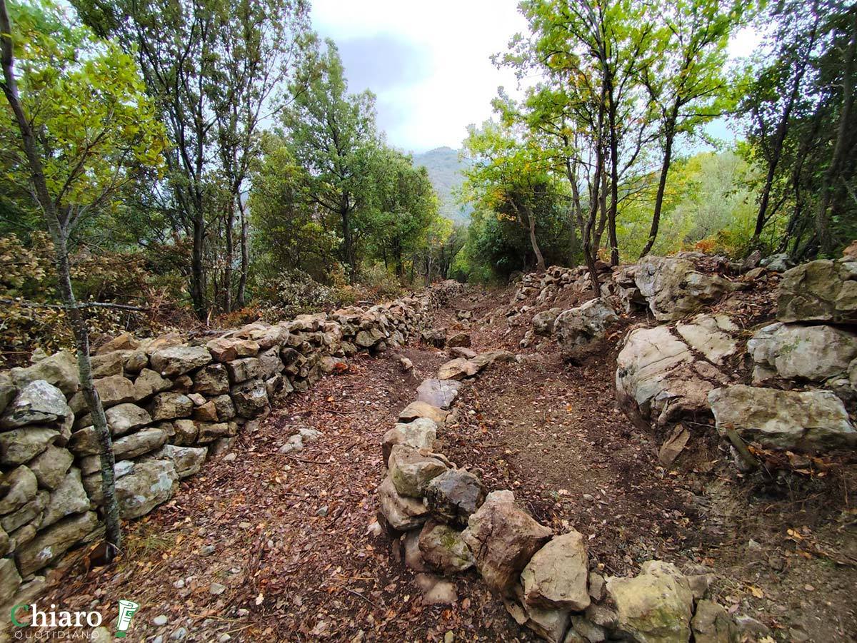 I muretti a secco sono anche testimoni del tempo e del destino delle aree interne. Con il progressivo spopolamento e abbandono delle terre, sono venuti meno quegli agricoltori che ne curavano la manutenzione, così, a causa degli agenti atmosferici e anche dell’azione degli animali (cinghiali soprattutto), anno dopo anno, sono crollati. Prima che i volontari si mettessero al lavoro, al posto degli ordinati sentieri odierni c’erano impraticabili distese di pietre e massi.