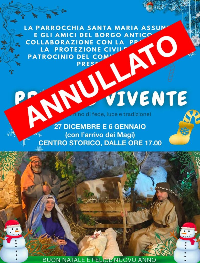 A causa delle previsioni meteo avverse, non si terrà a Lentella il secondo appuntamento con il presepe vivente. Dopo la prima data del 27 dicembre, la rappresentazione della Natività – organizzata dalla parrocchia di S. Maria Assunta con il patrocinio del Comune e in collaborazione con le associazioni locali – si sarebbe dovuta tenere domani 6 gennaio. Il parroco don Antony Doss Irudhayasamy, in considerazione delle previsioni meteo, ha deciso per l’annullamento della seconda data.