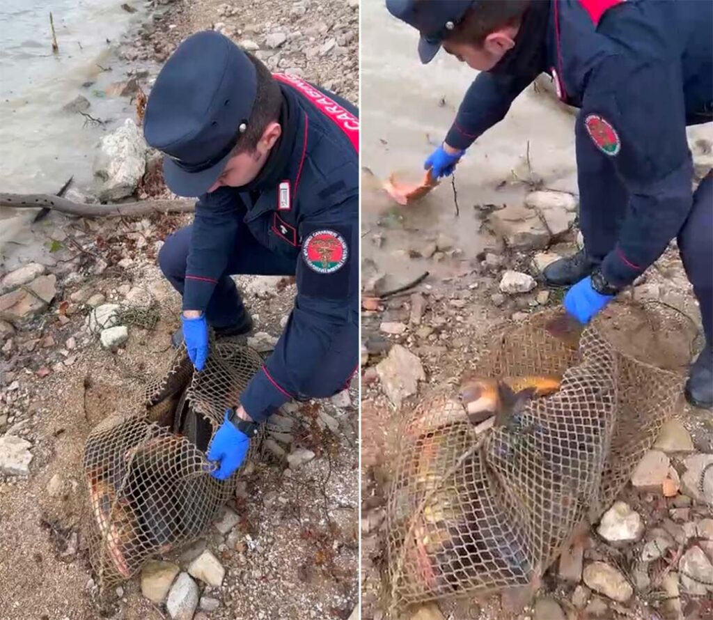 Dopo gli accertamenti, i militari hanno rinvenuto una rete immersa nelle acque del lago contenente 20 carpe – per un peso complessivo di circa 30 chilogrammi – trattenute in violazione delle norme vigenti. L’attività risultava infatti non conforme a quanto previsto dalla legge regionale n. 28/2017 e dal calendario ittico regionale, che disciplinano in modo rigoroso l’attività di pesca e vietano la detenzione del pescato nelle zone destinate alla tutela ambientale e al ripopolamento delle specie ittiche.