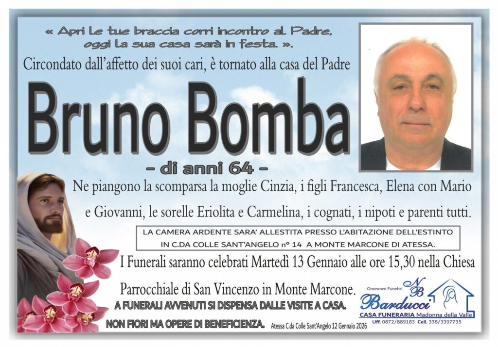 Le esequie si svolgeranno domani, martedì 13 gennaio, alle 15, nella chiesa di San Vincenzo a Montemarcone di Atessa. Alla moglie Cinzia, ai figli Francesca, Elena e Giovanni le sentite condoglianze di Chiaro Quotidiano.