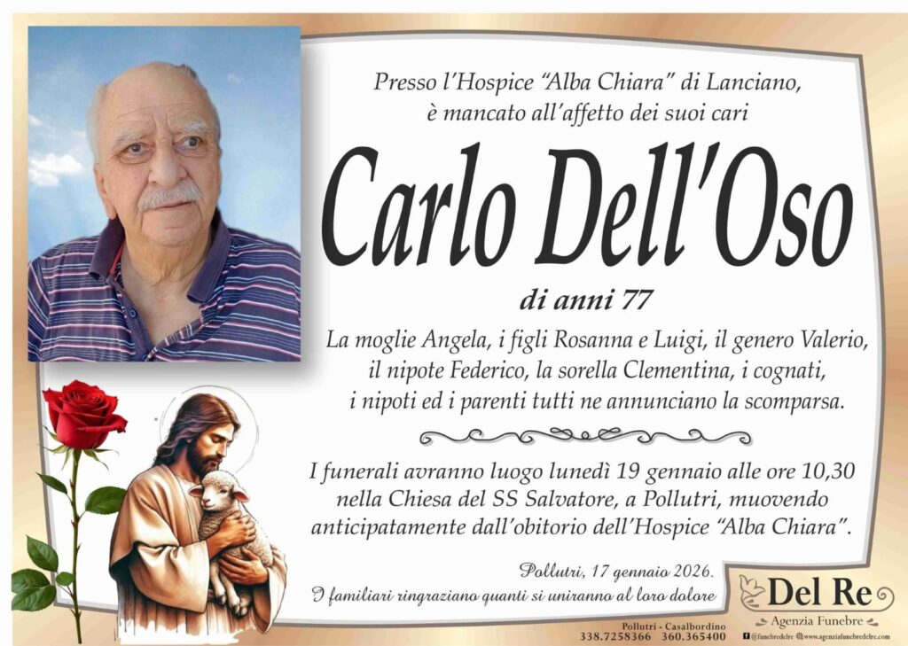 Le esequie saranno celebrate lunedì 19 gennaio, alle 10.30, nella chiesa del Santissimo Salvatore a Pollutri. Alla moglie Angela, ai figli Rosanna e Luigi e a tutti i familiari le sentite condoglianze della redazione di Chiaro Quotidiano.