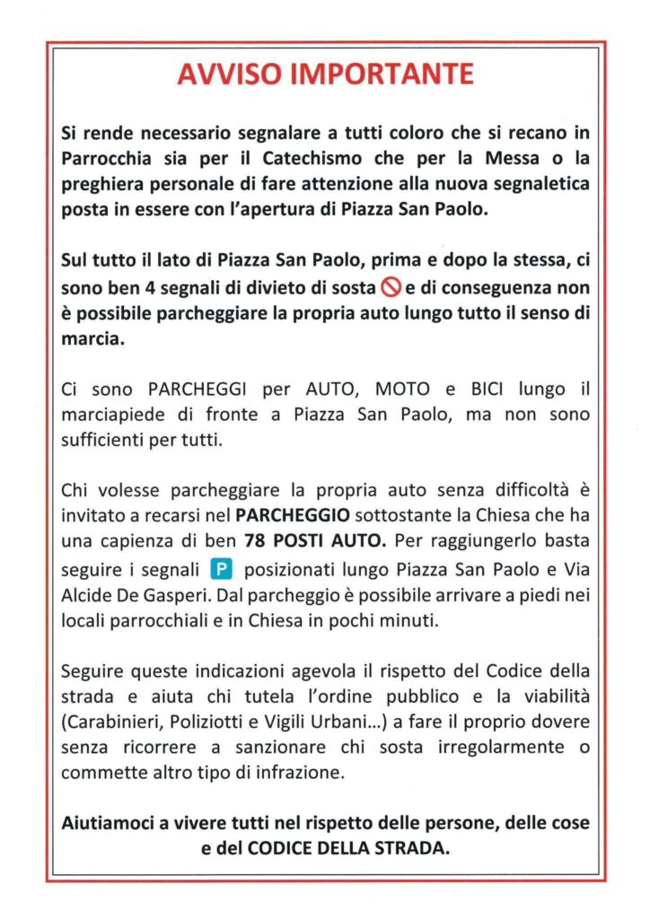 «Si rende necessario segnalare a tutti coloro che si recano in parrocchia sia per il catechismo che per la messa o la preghiera personale di fare attenzione alla nuova segnaletica posta in essere con l’apertura di piazza San Paolo», si legge nel testo. «Su tutto il lato di piazza San Paolo, prima e dopo la stessa, ci sono per 4 segnali di divieto di sosta e di conseguenza non è possibile parcheggiare la propria auto lungo tutto il senso di marcia».