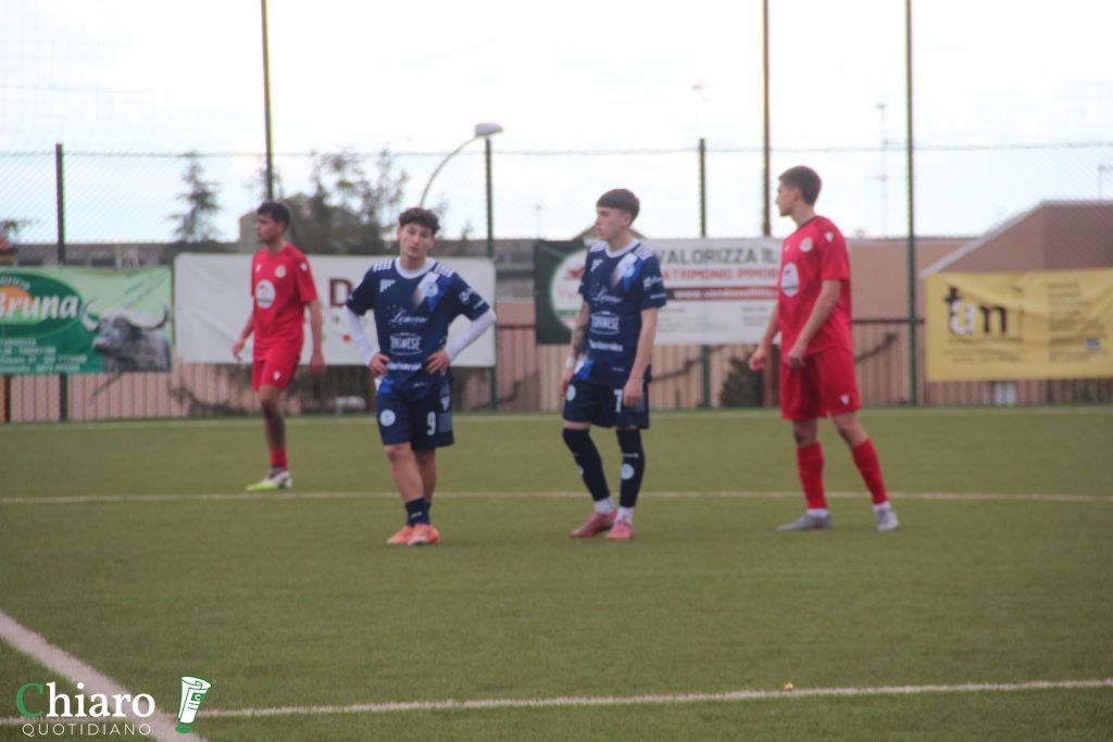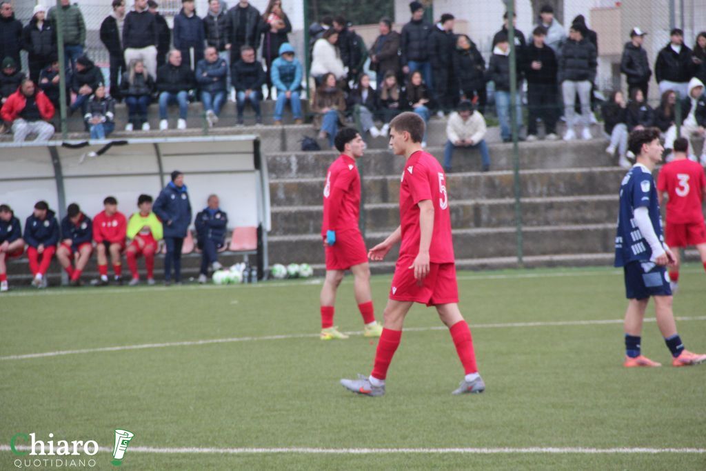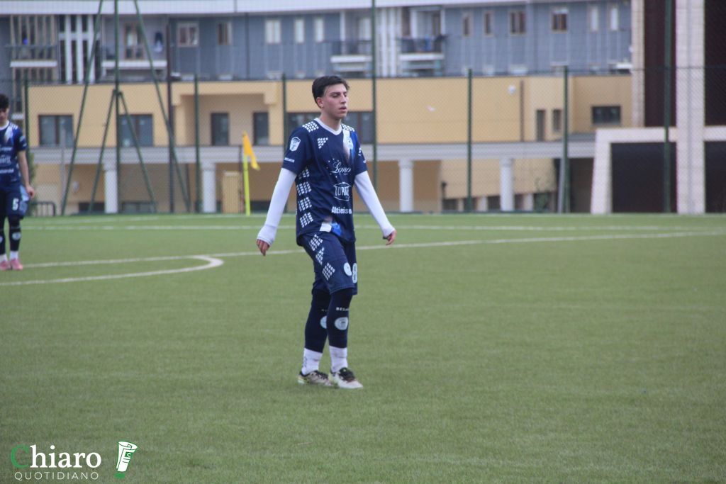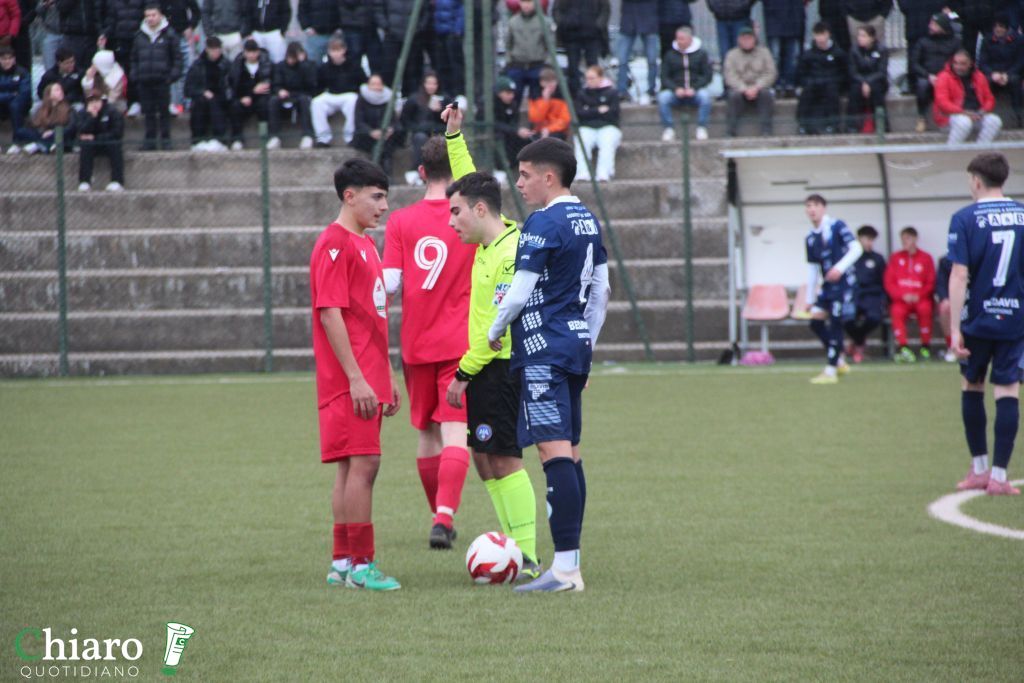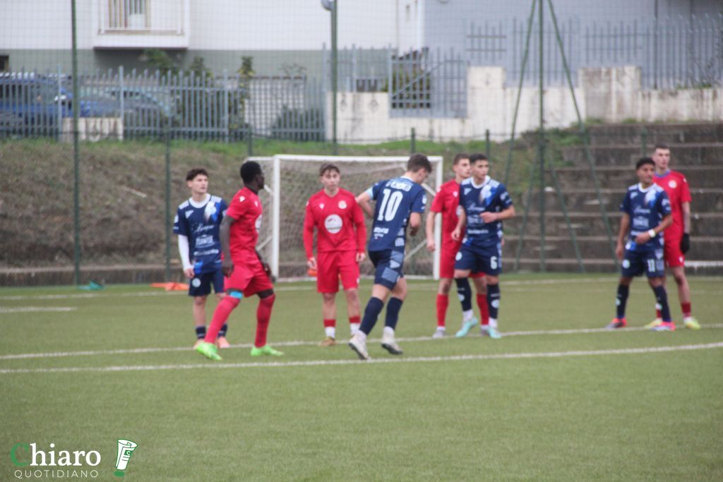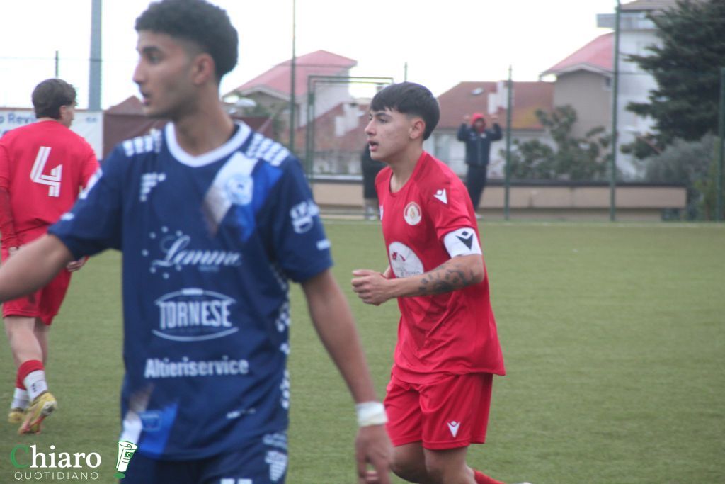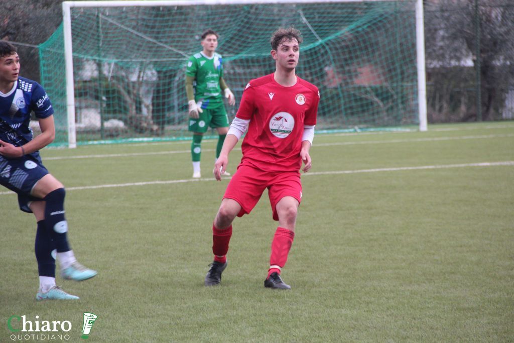 La partita – Moduli a specchi per i due allenatori, Loris Carbonelli in avanti si affida al centravanti Valentini (arrivato durante la sosta dal Roccaspinalveti) assistito dal capitano Ventrella e Colanzi. I “big” Tafili e Kone occupano la mediana completata da Cupaioli. Due 2006, quattro 2008 e cinque 2007. In porta Acquarola, davanti a lui Cela e De Santis insieme ai laterali Galante e Luciani. Sulla sponda biancazzurra Alessandro Ciccotosto sceglie il portiere Fiore, sui lati Di Tullio e Okoroji con i centrali Loreta e Giammichele. Nel cuore del gioco Prestigiacomo accompagna capitan Di Marino e Raspa, in avanti tridente “leggero” con Esposito “falso nueve” supportato da Waldi e Mastragostino. Un 2006, addirittura due 2009, tre 2007 e cinque 2008, tra questi “Lele” Mastragostino che, dopo appena trenta secondi, di testa, sblocca immediatamente il match. La Pro Vasto colpita a freddo reagisce con orgoglio e, al quindicesimo trova il pari con il 2006 Emirson Tafili che, da due passi, deposita in rete, l’assist aereo di Valentini. I biancorossi di casa spingono forte e, in poco più di sessanta secondi, tra il ventiseiesimo e il ventisettesimo cestinano due clamorose palle gol che avrebbero fatto rima con rimonta. Prima sugli sviluppi di una punizione calciata da Tafili Fiore non trattiene, da zero centimetri Ventrella colpisce clamorosamente il palo. Qualche secondo più tardi Valentini indovina lo stop ma viene ipnotizzato dall’estremo biancazzurro.