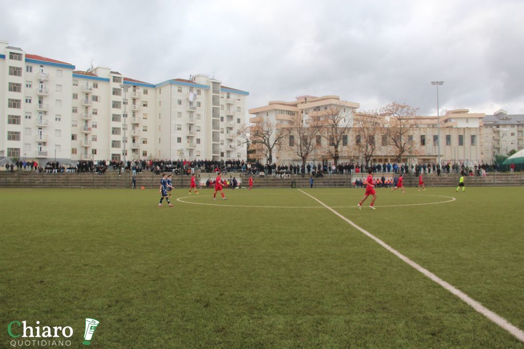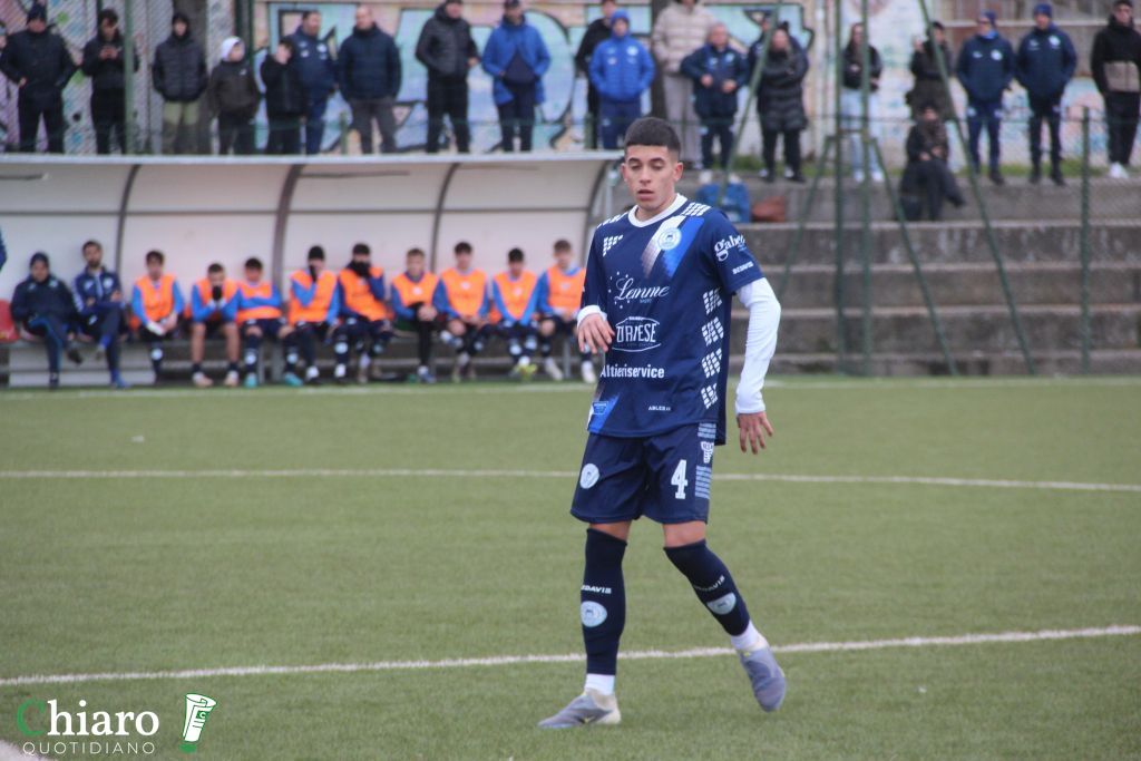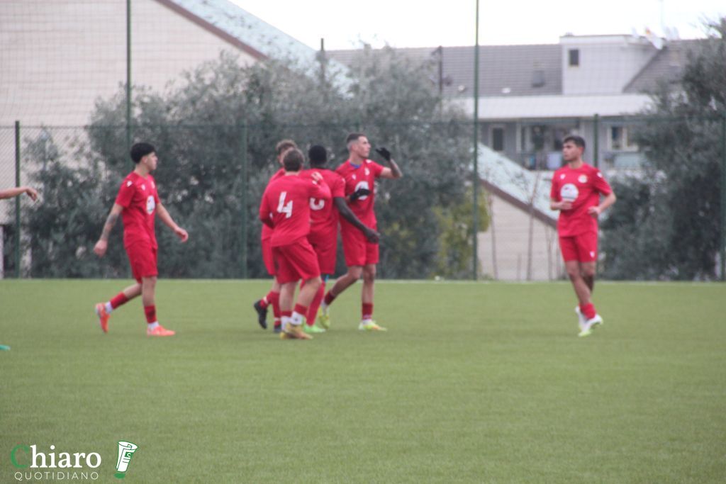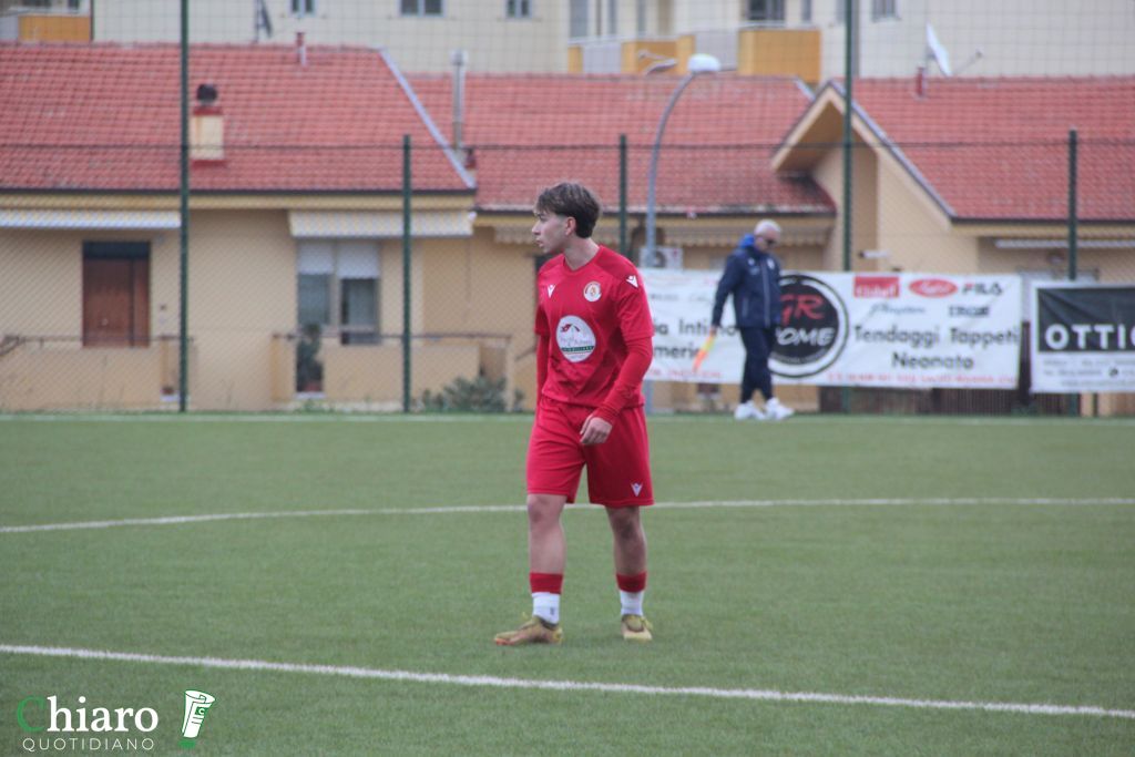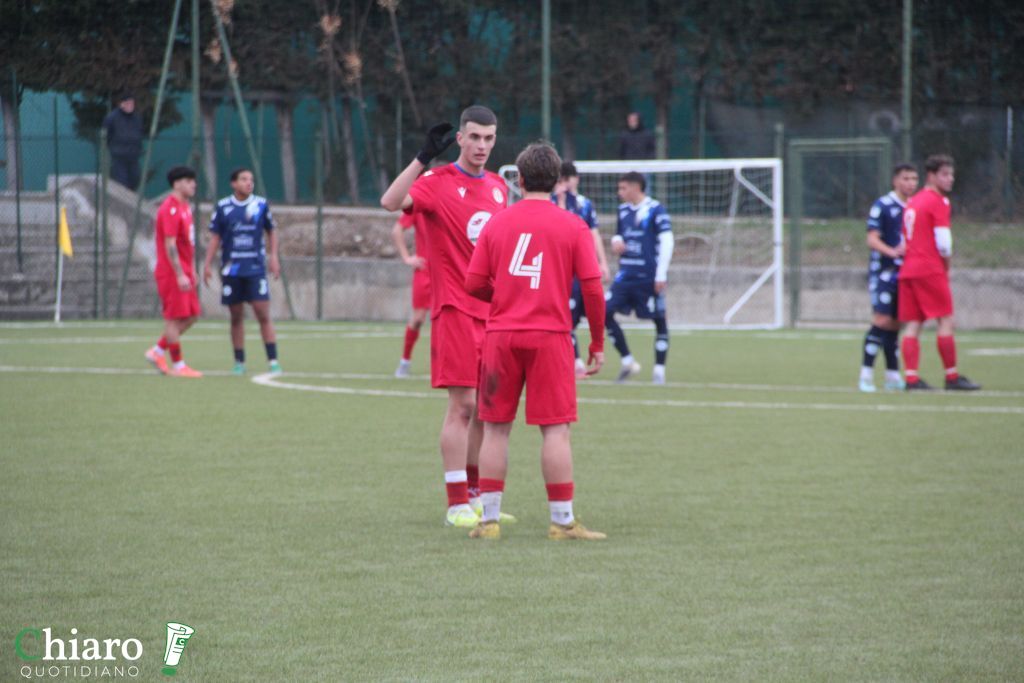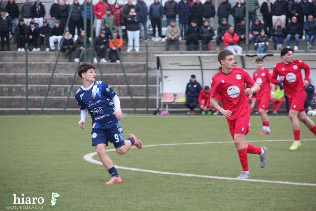 La partita – Moduli a specchi per i due allenatori, Loris Carbonelli in avanti si affida al centravanti Valentini (arrivato durante la sosta dal Roccaspinalveti) assistito dal capitano Ventrella e Colanzi. I “big” Tafili e Kone occupano la mediana completata da Cupaioli. Due 2006, quattro 2008 e cinque 2007. In porta Acquarola, davanti a lui Cela e De Santis insieme ai laterali Galante e Luciani. Sulla sponda biancazzurra Alessandro Ciccotosto sceglie il portiere Fiore, sui lati Di Tullio e Okoroji con i centrali Loreta e Giammichele. Nel cuore del gioco Prestigiacomo accompagna capitan Di Marino e Raspa, in avanti tridente “leggero” con Esposito “falso nueve” supportato da Waldi e Mastragostino. Un 2006, addirittura due 2009, tre 2007 e cinque 2008, tra questi “Lele” Mastragostino che, dopo appena trenta secondi, di testa, sblocca immediatamente il match. La Pro Vasto colpita a freddo reagisce con orgoglio e, al quindicesimo trova il pari con il 2006 Emirson Tafili che, da due passi, deposita in rete, l’assist aereo di Valentini. I biancorossi di casa spingono forte e, in poco più di sessanta secondi, tra il ventiseiesimo e il ventisettesimo cestinano due clamorose palle gol che avrebbero fatto rima con rimonta. Prima sugli sviluppi di una punizione calciata da Tafili Fiore non trattiene, da zero centimetri Ventrella colpisce clamorosamente il palo. Qualche secondo più tardi Valentini indovina lo stop ma viene ipnotizzato dall’estremo biancazzurro.