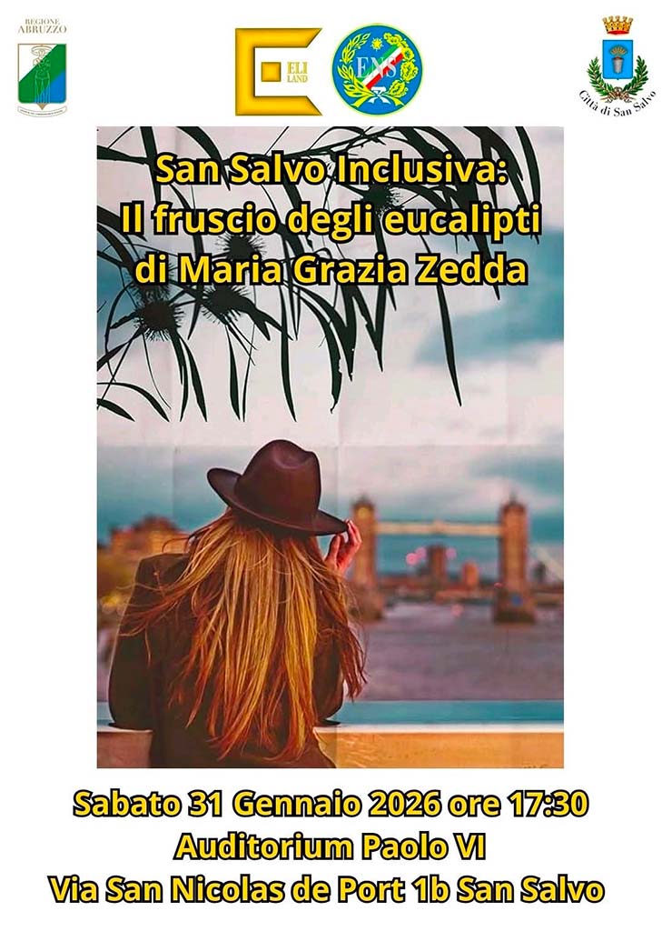Sabato 31 gennaio, alle ore 17.30, a San Salvo,nell’Auditorium Paolo VI (via S. Nicolas de Port 1/B), si terrà l’evento San Salvo inclusiva: il fruscio degli eucalipti di Maria Grazia Zedda, promosso dall’associazione Eliland in collaborazione con la sezione provinciale dell’Ens.