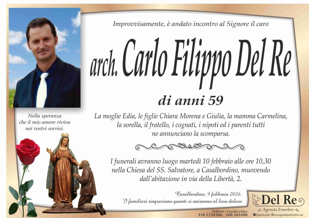 Sta suscitando incredulità e commozione a Casalbordino l’improvvisa scomparsa di Carlo Filippo De Re. Aveva 59 anni. Di professione architetto, in paese era conosciuto e apprezzato per le qualità professionali e le doti umane.