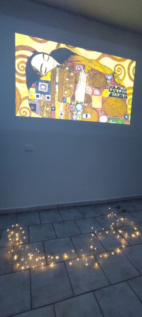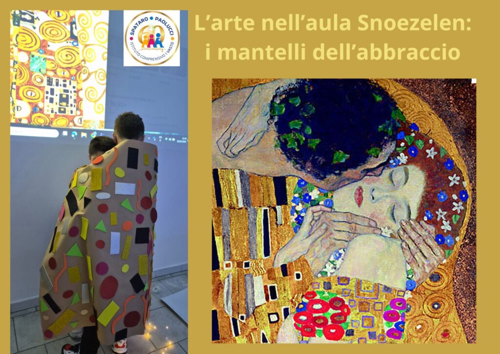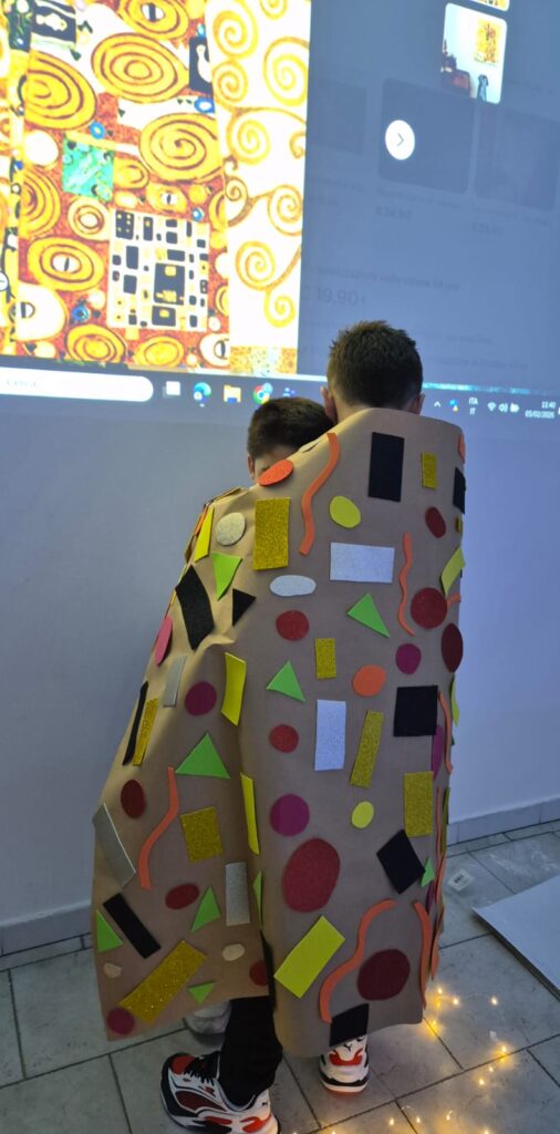 In un ambiente pensato per stimolare i sensi attraverso luci, suoni e materiali, i bambini si sono avvicinati all’arte di Gustav Klimt, lasciandosi ispirare da Il Bacio (1908), uno dei capolavori più iconici della storia dell’arte. Da qui è nata l’idea dei mantelli dell’abbraccio, un progetto che «unisce arte, relazione ed emozione».
