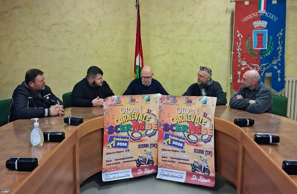 È stata presentata stamattina la 51ª edizione del Gran Carnevale scernese. Alla conferenza stampa di presentazione hanno preso parte il sindaco di Scerni, Daniele Carlucci, il presidente dell’associazione Carnevalari, Ottavio Ubaldi e alcuni componenti dell’associazione.
