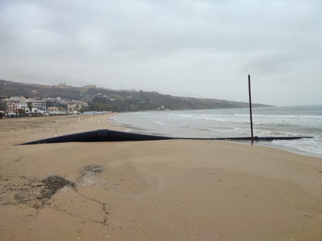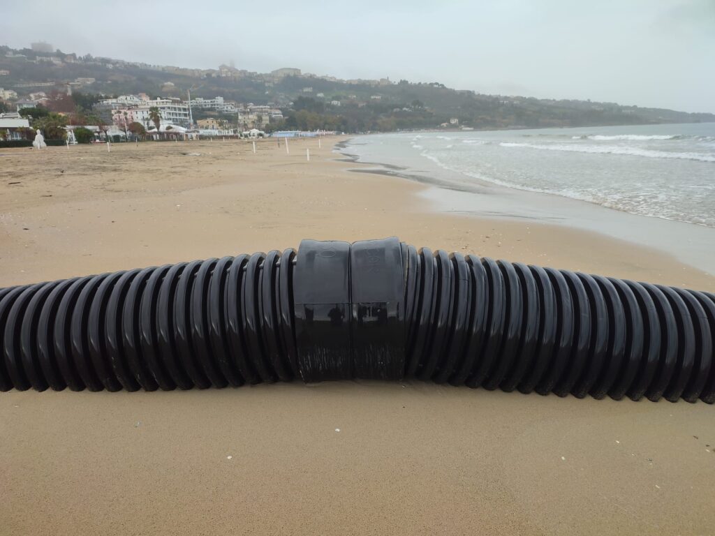 Le piogge scavano la sabbia e riportano alla luce ciò che sembrava sepolto. Sulla spiaggia di Vasto Marina riemergono i grossi tubi di plastica degli scarichi a mare, mentre Fosso Marino torna a tracimare a poche decine di metri dal pontile.