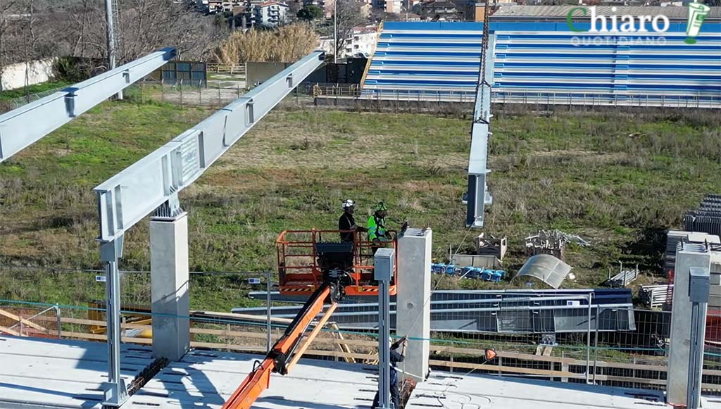 Gli interventi di ricostruzione della tribuna coperta sono ripresi dopo l’inizio del nuovo anno con la sistemazione delle travi [LEGGI] e della copertura. Una volta terminati, si potrà passare al campo.