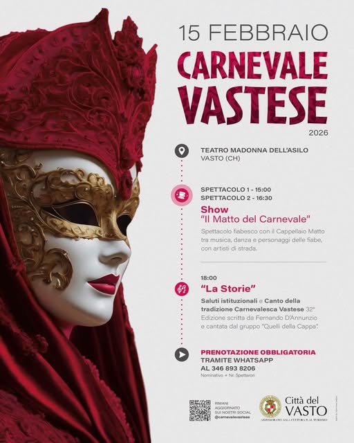 «Il programma sarà il seguente: spettacolo 1, ore 15; spettacolo 2, ore 16:30; La Storie, saluti istituzionali e canto della tradizione carnevalesca vastese, ore 18. Posti limitati. Prenotazione obbligatoria e gratuita tramite WhatsApp al +39 346 893 8206 (indicare nominativo e numero spettatori). Una scelta responsabile per garantire sicurezza, senza rinunciare alla magia, alla tradizione e al sorriso dei bambini».