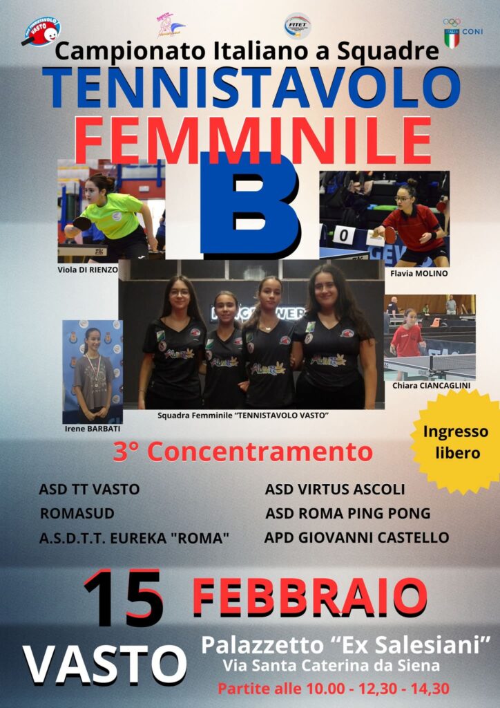 In corso di svolgimento oggi a Vasto il 3° Concentramento nazionale del Campionato italiano di serie B di tennistavolo femminile. Le gare sono in programma alle ore 10, 12,30 e 14,30 al palazzetto dello sport ex salesiani, in via Santa Caterina da Siena. Sei le squadre partecipanti: Tennistavolo Vasto, Romasud, Tennistavolo Eureka Roma, Virtus Ascoli, Roma Ping Pong, Giovanni Castello. L’ingresso è libero.