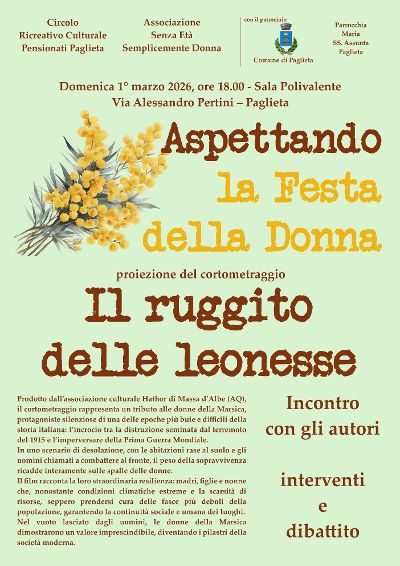 La manifestazione prevede la proiezione del cortometraggio Il ruggito delle leonesse, prodotto dall’associazione culturale Hathor di Massa d’Albe (Aq), un tributo alle donne della Marsica che affrontarono la distruzione del terremoto del 1915 e le difficoltà della Prima guerra mondiale. «In uno scenario di desolazione, con le abitazioni rase al suolo e gli uomini chiamati al fronte, il peso della sopravvivenza ricadde sulle donne: madri, figlie e nonne che, nonostante il clima estremo e la scarsità di risorse, garantirono la continuità sociale e umana dei luoghi occupandosi delle fasce più deboli. Le donne della Marsica dimostrarono così un valore imprescindibile, diventando i pilastri della società moderna».