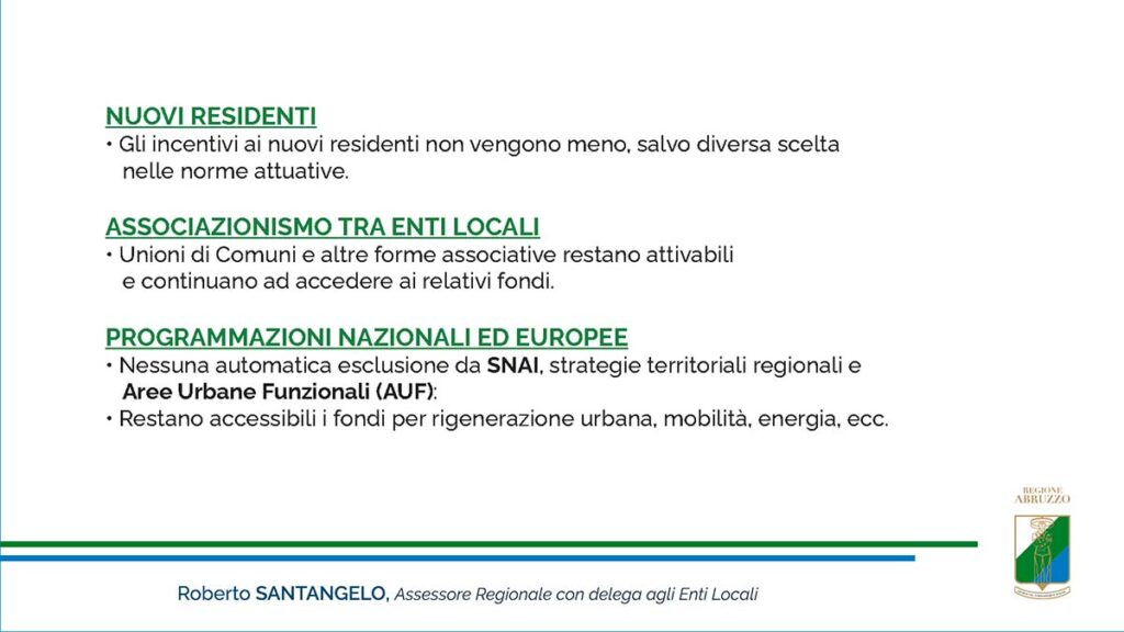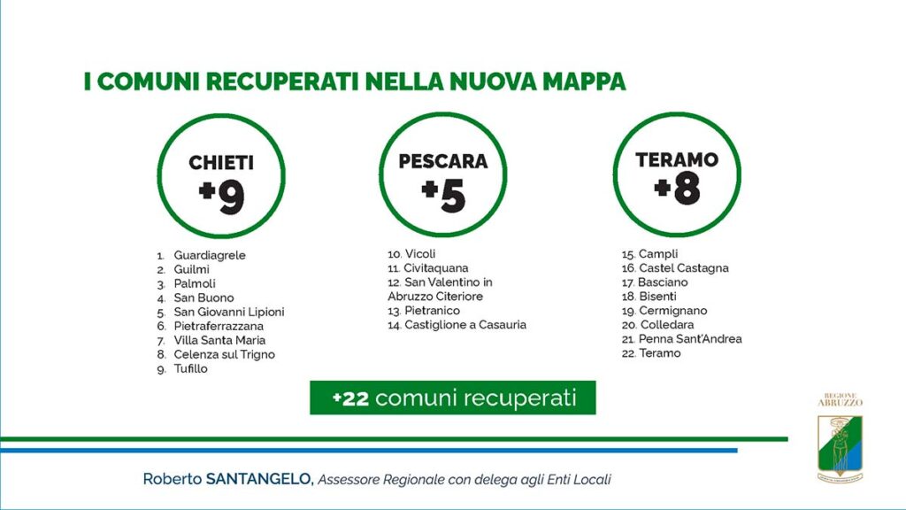 Per meglio illustrare le novità dell’ultima versione, i due esponenti regionali hanno proiettato alcune slide riassuntive. Nella prima bozza, il taglio in Abruzzo riguardava 58 comuni, numero ora sceso a 27.