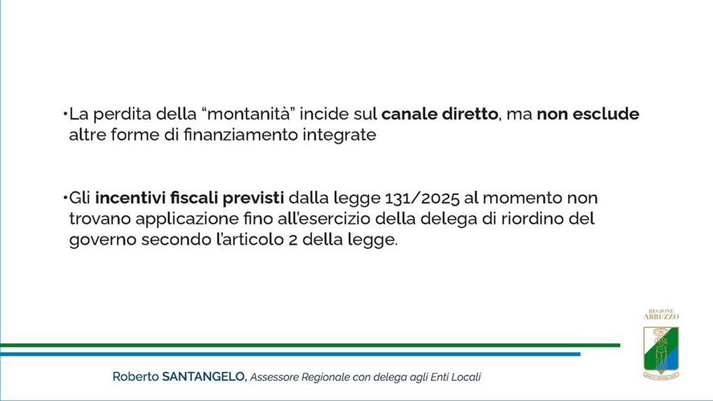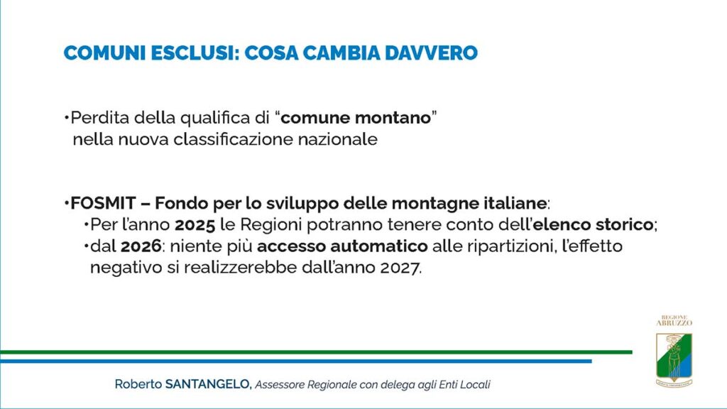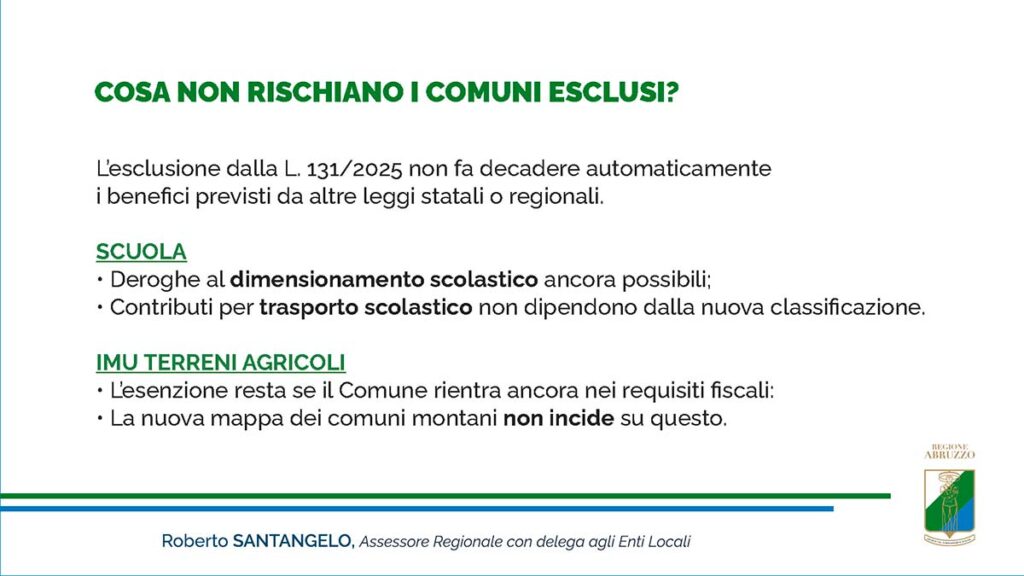 «La conferenza stampa si è resa necessaria per chiarire cosa sia realmente la riforma della legge sulla montagna», ha detto Santangelo che poi ha sottolineato come nei 27 esclusi «non ci sarà alcun rischio per la chiusura delle scuole o per la perdita di servizi essenziali. Nella Conferenza unificata abbiamo previsto la possibilità di intervenire con fondi regionali nelle cosiddette zone di cerniera, garantendo risorse anche ai territori che hanno perso formalmente il titolo di comune montano».