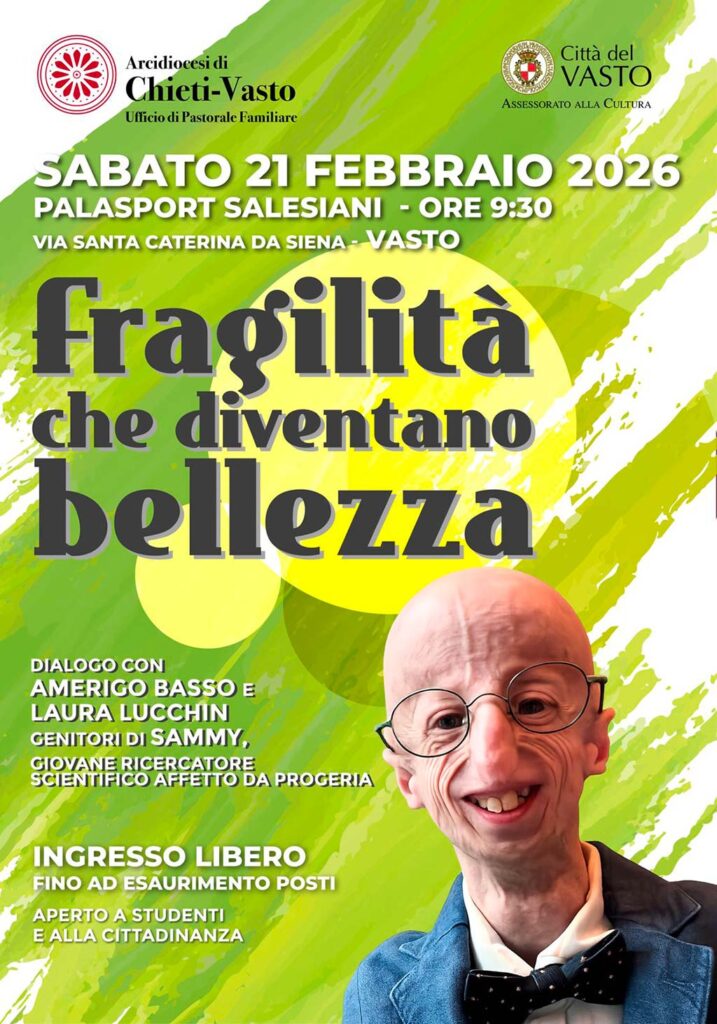 Sabato 21 febbraio (ore 9.30), al palasport Salesiani di via Santa Caterina da Siena di Vasto, si svolgerà l’evento Fragilità che diventano bellezza, un incontro dedicato ai giovani vastesi a cui prenderanno parte i genitori del compianto giovane ricercatore scientifico Sammy Basso, Amerigo Basso e Laura Lucchin. L’iniziativa è promossa dall’ufficio di Pastorale familiare dell’Arcidiocesi di Chieti-Vasto e dall’assessorato alla Cultura del Comune di Vasto.
