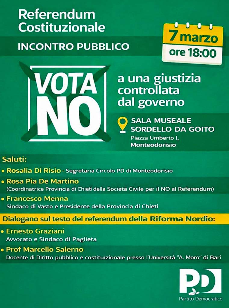 Alle ore 18, nella sala museale “Sordello da Goito”, ci saranno gli interventi di Ernesto Graziani (avvocato e sindaco di Paglieta) e Marcello Salerno (docente di Diritto pubblico e costituzionale all’università di Bari). Ad aprire l’incontro i saluti di Rosalia Di Risio (segretaria Pd Monteodorisio), Rosa Pia De Martino (coordinatrice provinciale del comitato per il “No”) e Francesco Menna (sindaco di Vasto e presidente della Provincia di Chieti).