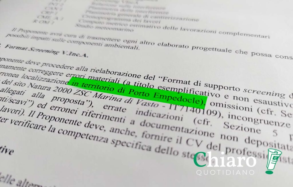 Non solo carenze, ma l’iter è viziato anche da grossolane sviste nella scarna documentazione inviata, ad esempio nello screening per la valutazione di incidenza ambientale. Il documento, anch’esso fondamentale, dovrà essere rinviato perché quello già depositato contiene «errori, omissioni, incongruenze, errate indicazioni ed erronei riferimenti a documentazione non depositata». Tra questi basti citare che come area interessata dal progetto viene citato, due volte, il territorio di Porto Empedocle. Nel passaggio in cui si cita la «documentazione non depositata», la commissione si riferisce, di nuovo, al cronoprogramma dei lavori: oggi, quindi, non è conosciuta neanche una stima della durata degli interventi.