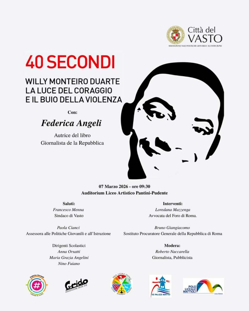 «La figura di Willy Monteiro Duarte – dice il sindaco di Vasto, Francesco Menna – rappresenta per tutti noi un simbolo di coraggio civile, di rispetto e di difesa dei valori fondamentali della convivenza. Con questa iniziativa i nostri giovani potranno vivere un momento di riflessione profonda sul valore della vita e dell’amicizia. Come amministrazione comunale crediamo fortemente nel ruolo dell’educazione come strumento per contrastare ogni forma di violenza, bullismo e indifferenza. Parlare di Willy significa parlare di rispetto e responsabilità e per questo non deve essere dimenticato. Ringrazio tutti coloro che hanno contribuito alla realizzazione di questo convegno e sono certo che sarà un’occasione importante per trasmettere un messaggio chiaro. La legalità e il coraggio civile sono valori che devono guidare ogni giorno le nostre scelte».