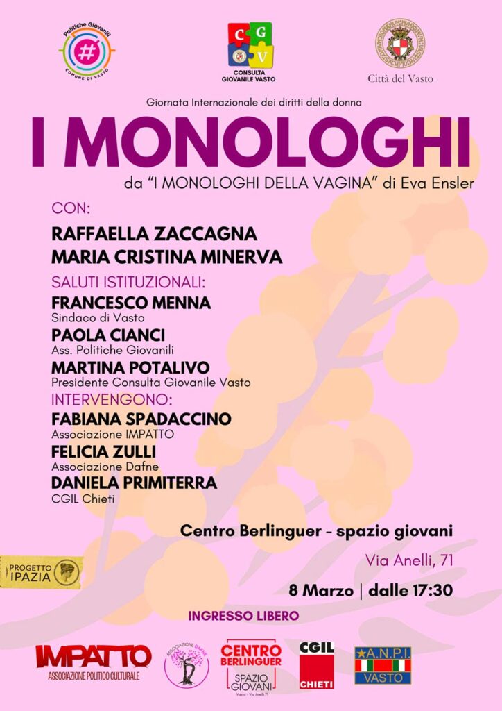 «La Consulta giovanile di Vasto è entusiasta di portare in scena I Monologhi della Vagina – aggiunge Potalivo – un’opera che continua a colpirci per la sua forza, la sua sincerità e la capacità di parlare anche alle nuove generazioni. Si tratta di un ulteriore passo nel percorso del progetto Ipazia, che mira a difendere e valorizzare i diritti delle donne con uno sguardo libero, contemporaneo e partecipato».