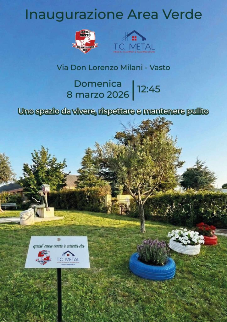 Domenica 8 Marzo. alle 12:45, il Futsal Vasto in collaborazione con la TC Metal inaugurerà l’area verde in via Don Lorenzo Milani, angolo via Conti Ricci.