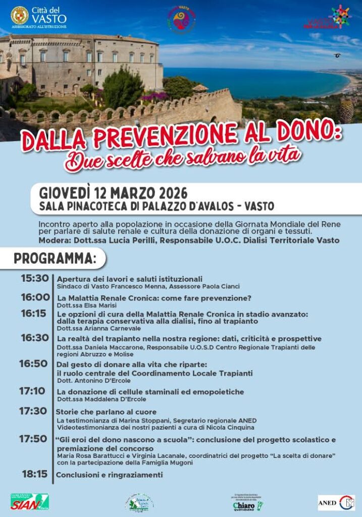 «Giovedì 12 marzo, in occasione della Giornata Nazionale del Rene, presso la Pinacoteca di Palazzo d’Avalos, a partire dalle ore 15:30, si svolgerà il convegno dal titolo Dalla prevenzione al dono: due scelte che salvano la vita. L’iniziativa è promossa dal Comune di Vasto, dal Reparto di Nefrologia – Dialisi di Vasto (ASL Lanciano – Vasto – Chieti), da Aned e Aido. L’incontro conclude il progetto La scelta di donare. Gi eroi del dono nascono a scuola, dedicato alla sensibilizzazione sulla donazione degli organi, avviato nel novembre 2025 in collaborazione con l’Assessorato all’Istruzione e rivolto alle scuole secondarie di secondo grado della città: Polo Liceale Pantini-Pudente, Polo Liceale Statale R. Mattioli e I.I.S. Mattei-Palizzi». Lo annuncia una nota del municipio.