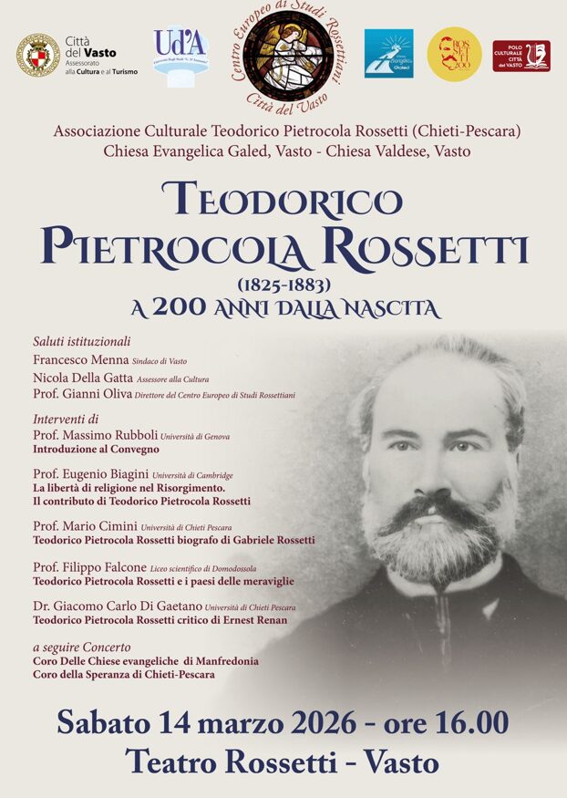 «In un prestigioso convegno internazionale al Teatro Rossetti Vasto ricorda la figura di Teodorico Pietrocola Rossetti a 200 anni dalla nascita. Il 14 marzo, alle ore 16, il Centro Europeo di Studi Rossettiani, che da anni custodisce il patrimonio culturale della città». Il professor Gianni Oliva, direttore del Centro europeo di studi rossettiani, richiama studiosi di varie Università italiane e straniere per ricordare la figura di Teodorico Pietrocola Rossetti, «esponente di spicco della famiglia Rossetti, nipote di Gabriele per parte materna. Le vicende politiche di cui fu spettatore e protagonista saranno ampiamente ricostruite nelle relazioni previste per il convegno».
