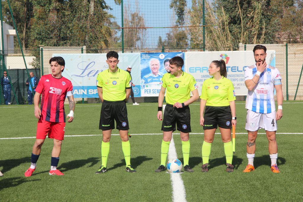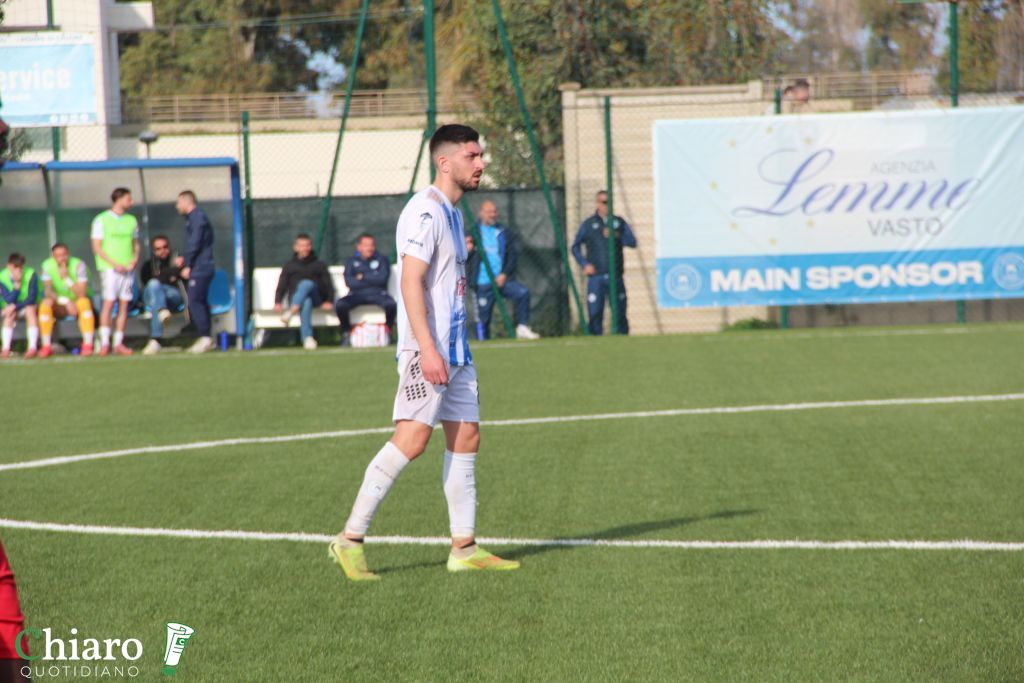 Il vento condiziona e non poco, le occasioni, nella prima mezzora latitano anche se la prima parte è di chiara marca vastese. Muratore viene ammonito per simulazione, poi una botta in diagonale di Vespasiano non trova lo specchio della porta. Nel finale di frazione si svegliano anche i rossoblù, contatto in area tra Troiano e Vespasiano, il capitano cupellese viene ammonito per simulazione e si dispera per la decisione di Calò. Prima di rientrare negli spogliatoi due occasioni colossali per il Cupello, sulla prima autostrada aperta da Cissé, Zaccardi penetra e calcia ma calcia addosso a Sciammarella che ringrazia e respinge. Tre minuti più tardi i protagonisti si “switchano”, spettacolare “ruleta” di Zaccardi in area, assist per Cissé che indovina la conclusione ma c’è il prodigio di Sciammarella che manda le squadre negli spogliatoi sullo 0 a 0.