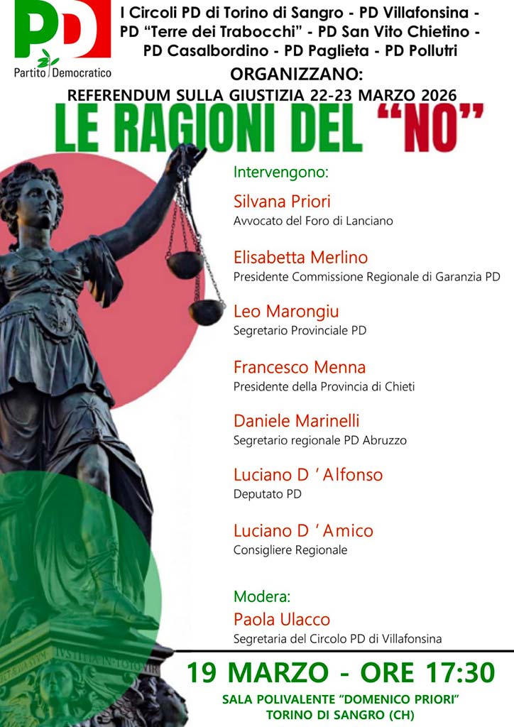 Cannone, eletto all’unanimità, ha parlato delle prossime scadenze: «Il nostro primo impegno è quello per il “No” al referendum sulla giustizia. Successivamente apriremo il cantiere per l’alternativa a Torino di Sangro con tutte le forze progressiste e civiche».