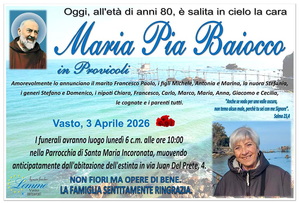 È morta a poco meno di due mesi dall’incidente nel quale era rimasta gravemente ferita Maria Pia Baiocco. L’80enne era rimasta coinvolta nel sinistro avvenuto il 10 febbraio sulla Statale 16 in territorio di Vasto, nella zona di Punta Penna. La donna viaggiava con il marito – 87enne, anche lui ferito – a bordo di una Renaul Modus che ha impattato con una Fiat Stilo; alla guida di questa seconda auto c’era il 69enne di origine vastese Mario Lalli che ha perso la vita sul colpo.