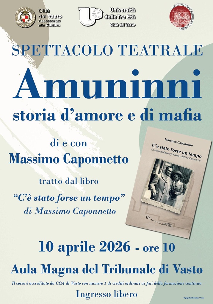 «Scritto e interpretato da Massimo Caponnetto, lo spettacolo teatrale Amuninni è tratto dal libro C’è stato forse un tempo e propone una narrazione intensa che intreccia vicende personali e attraversa la stagione del maxi processo, quella delle stragi e termina con le riflessioni di Bettina dopo 10 anni dalla morte di Nino». Lo scrive l’Università delle Tre Età di Vasto nel comunicato in cui annuncia lo spettacolo che si terrà domani, venerdì 10 aprile, nell’aula magna del tribunale. L’appuntamento è organizzato in collaborazione con l’Ordine forense vastese e patrocinato dal Comune. «Attraverso il linguaggio teatrale, Caponnetto – da anni impegnato nella divulgazione della cultura della legalità – offre al pubblico un racconto coinvolgente e ricco di significato. Oggi questo è diventato anche un progetto teatrale per ragazzi: Teatro e Legalità che si propone di mettere i ragazzi al centro della scena facendo loro rappresentare i protagonisti della storia: Nino, Bettina, Giovanni Falcone e Paolo Borsellino».
