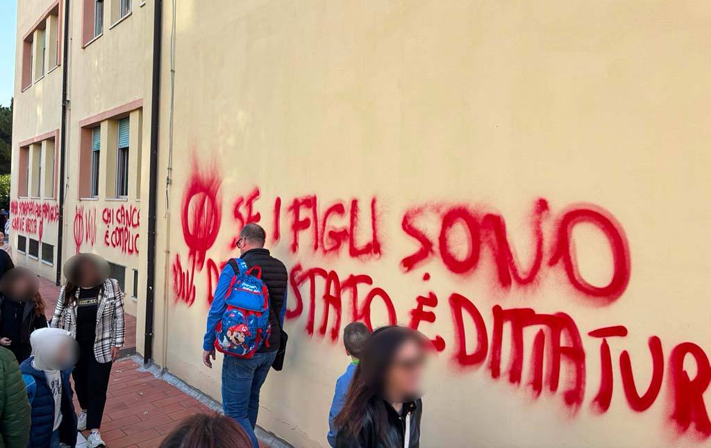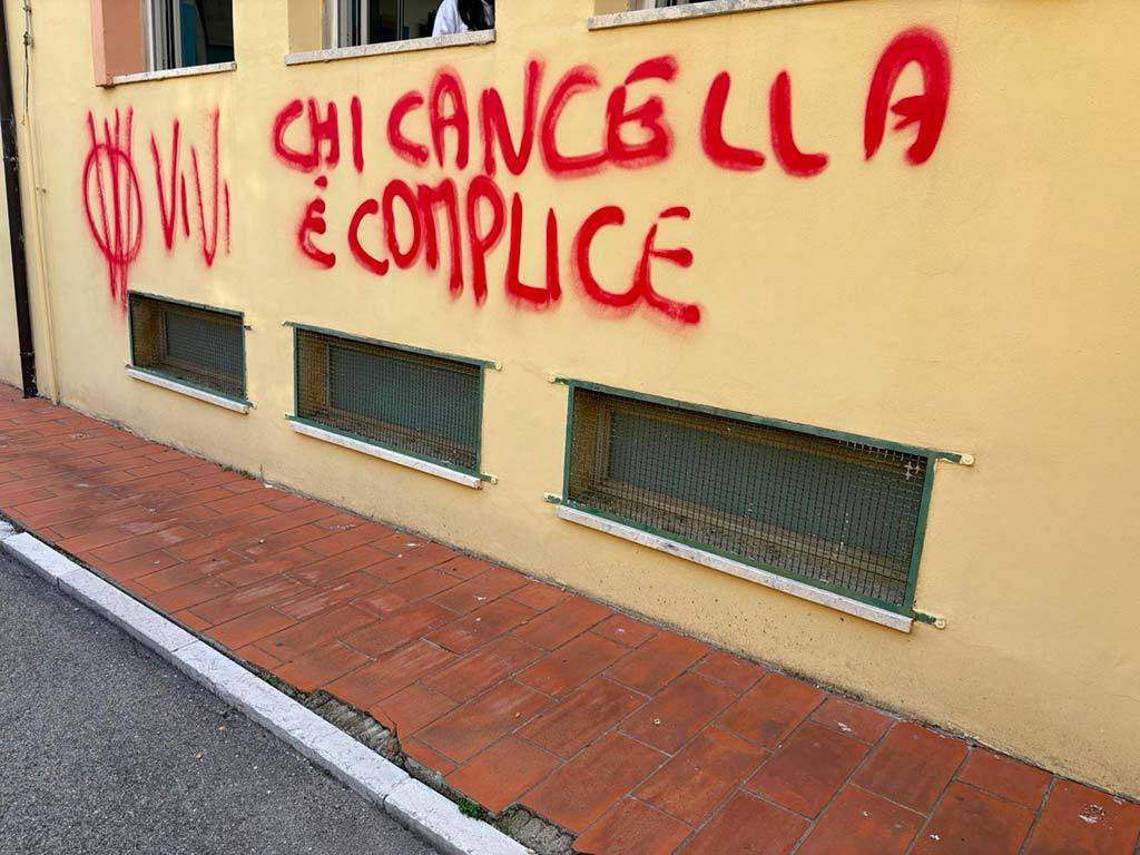 Le scritte contro una presunta “dittatura” e contro le figure istituzionali coinvolte nella vicenda sono firmate dallo stemma di una “W” cerchiata, simbolo che si identifica con “Vivi”, usato già anni fa in azioni simili da gruppi no-vax che si opponevano a vaccini e green pass.