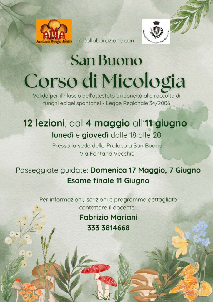 A partire dal 4 maggio, l’Associazione Micologica Adriatica, in collaborazione con la Pro Loco di San Buono, avvia un corso di micologia aperto a tutti, condotto dall’ispettore micologico Fabrizio Mariani. L’obiettivo è di formare cittadini consapevoli del valore naturalistico del territorio, in grado di riconoscere i funghi spontanei e ottenere l’attestato d’idoneità alla raccolta, obbligatorio in Abruzzo, ma anche, e soprattutto, riattivare il legame tra le comunità e la natura che le circonda.