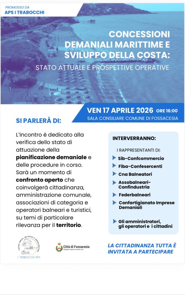 L’associazione I Trabocchi aps promuove un incontro pubblico dal titolo Concessioni demaniali marittime e sviluppo della costa: stato attuale e prospettive operative, in programma venerdì 17 aprile, alle ore 16, nella sala consiliare del Comune di Fossacesia.