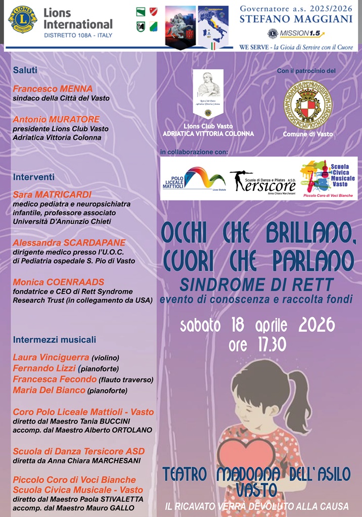 Raccogliere fondi per la ricerca e conoscere meglio la Sindrome di Rett, patologia poco nota che, però, annovera alcuni casi anche nel nostro territorio: queste le finalità di una nuova attività di servizio promossa dal Lions Club Vasto Adriatica Vittoria Colonna intitolata Occhi che brillano, cuori che parlano.
