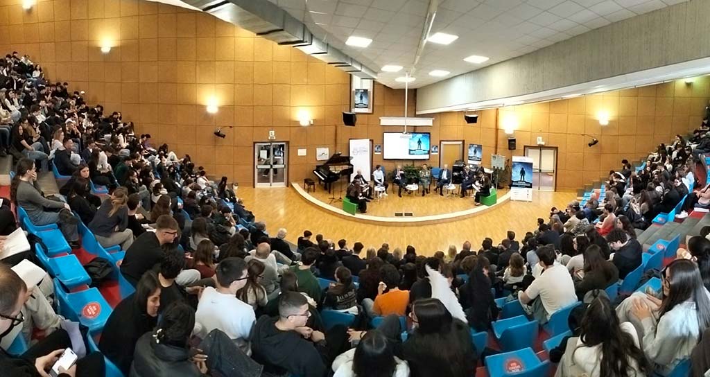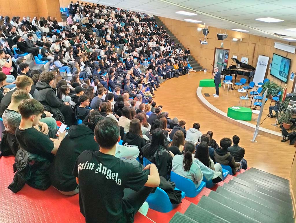 Nella mattinata di giovedì 16 aprile, il palcoscenico si è spostato all’auditorium del polo liceale “Raffaele Mattioli” per un incontro indirizzato alle studentesse e agli studenti degli istituti scolastici superiori della città; presenti i dirigenti Maria Grazia Angelini, Anna Orsatti e Gaetano Fuiano.