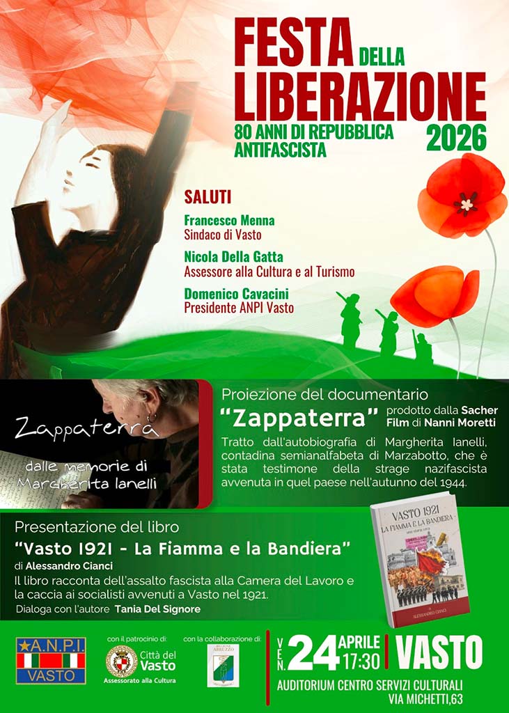 Completerà questo percorso la presentazione del volume Vasto 1921 – La Fiamma e la Bandiera, opera di Alessandro Cianci che scava nel passato locale per riportare alla luce i drammatici eventi del primo dopoguerra. Il libro documenta l’assalto fascista alla Camera del Lavoro e la caccia ai socialisti che segnarono la città nel 1921, fornendo una chiave di lettura fondamentale per comprendere le origini del fascismo (e le connivenze di cui ha goduto) anche nel territorio vastese. L’autore approfondirà i temi del saggio in un dialogo aperto con Tania Del Signore.
