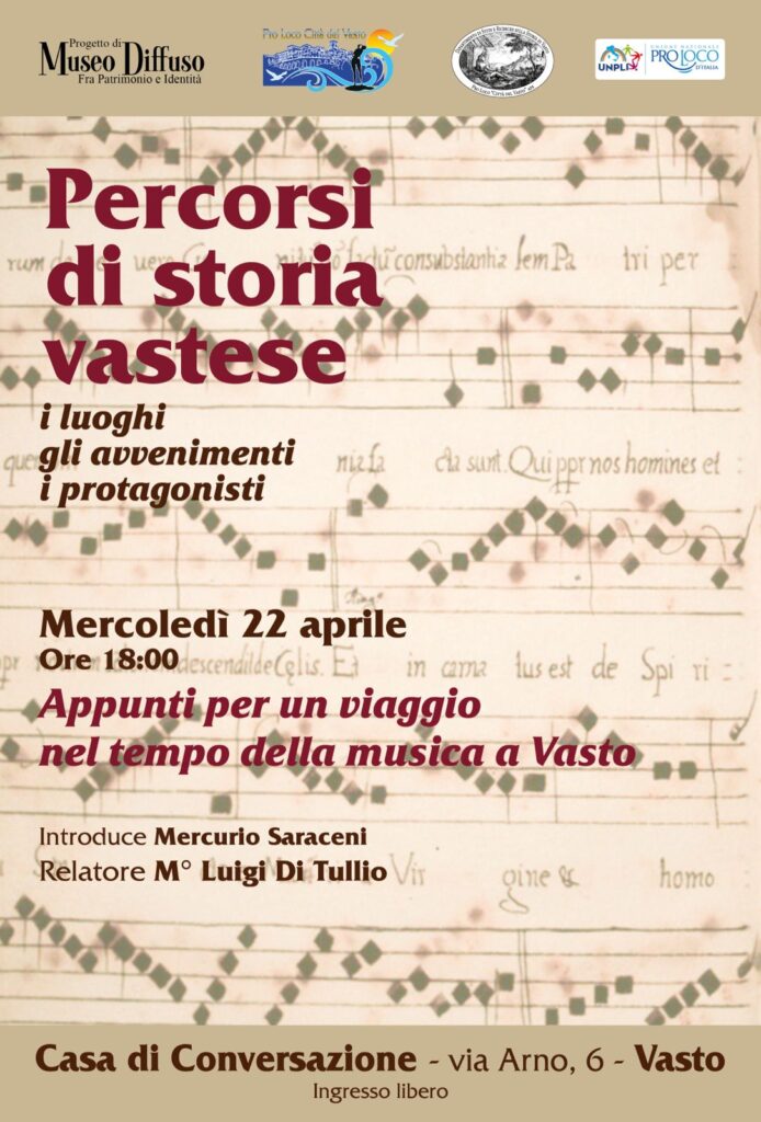 Mercoledì 22 aprile, alle ore 18, presso la Casa di Conversazione (via Arno, 6 – Vasto), si terrà l’incontro dal titolo Appunti per un viaggio nel tempo della musica a Vasto, un’occasione di approfondimento e riflessione sul patrimonio musicale locale, inteso come elemento identitario e testimonianza viva della storia cittadina.