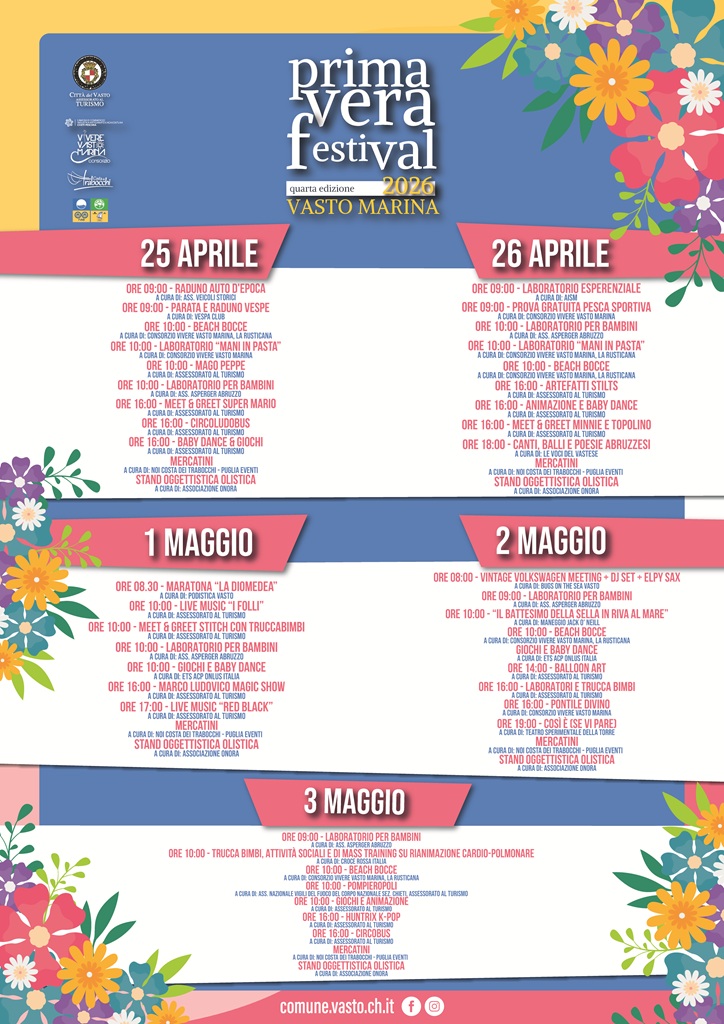 È stato reso noto il programma ufficiale della quarta edizione del Festival di Primavera, l’appuntamento che dal 25 al 26 aprile e dal 1° al 3 maggio 2026 animerà Vasto Marina con cinque giornate di eventi, spettacoli e intrattenimento sul lungomare.