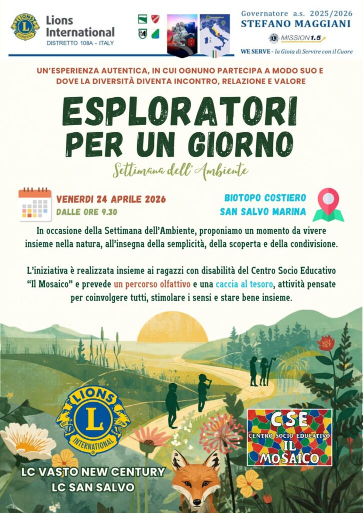 Una mattinata all’insegna della natura, dell’inclusione e della condivisione. Si è svolta venerdì 24 aprile, al Biotopo Costiero di San Salvo Marina, l’iniziativa “Esploratori per un giorno”, promossa dai Lions Club Vasto New Century e Lions Club San Salvo nell’ambito della Settimana dell’Ambiente.