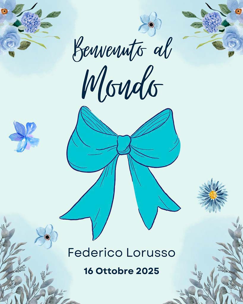 Ieri, 16 ottobre 2025, è nato Federico Lorusso! Benvenuto al piccolo e tantissimi auguri alla mamma Chiara e al papà Manolo.