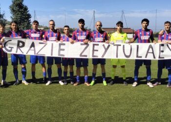 Capitan Frangione e compagni in campo con la maglia celebrativa