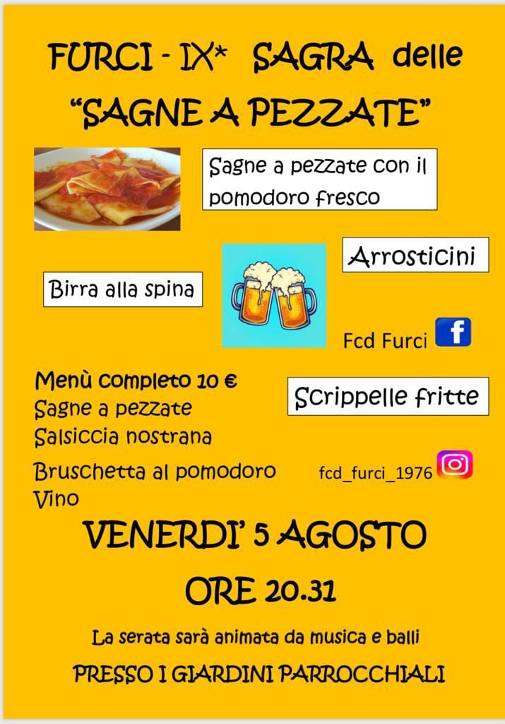 05ago20:30Sagra delle sagne a pezzateFurci - Giardini parrocchiali